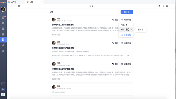 公司的管理员通过公告应用,可以向全体员工或指定部门员工发送通知,该条通知会以消息的形式出现在员工的飞书中。结合健康报备应用,管理员可以导出数据,对身体健康状况异常的员工进行特定信息的定向通知。