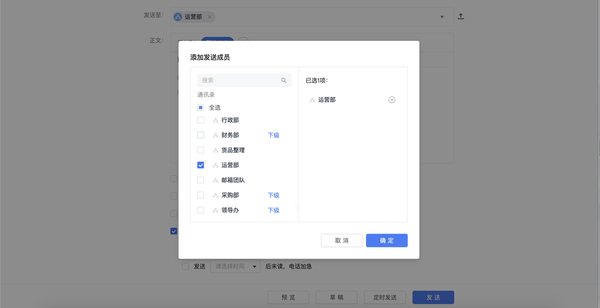 在公告管理页面,点击“新公告”按钮,进入公告编辑页面,点击“发送至”输入框,选择要通知的对象。可以选择全员、部门或特定人员。