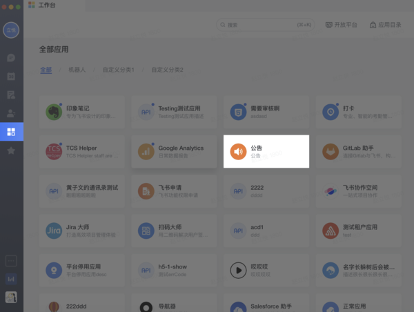 方法二:在飞书桌面端,进入侧边栏的工作台,点击公告应用。