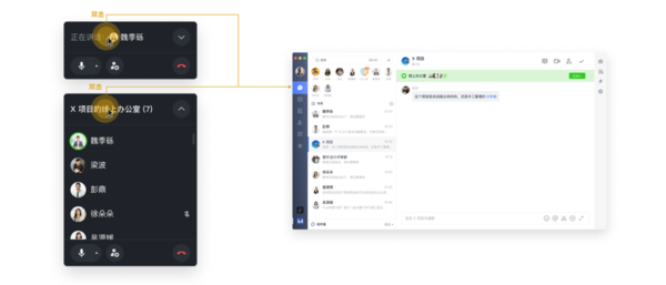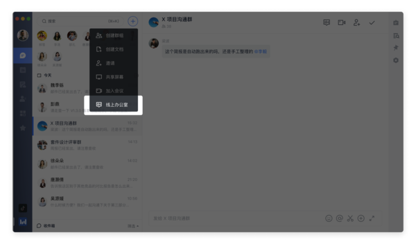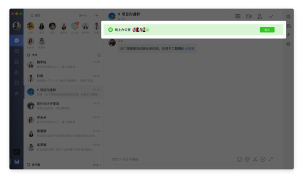方式1:点击聊天群右上角的线上办公室发起,群内成员可以通过点击加入进入。