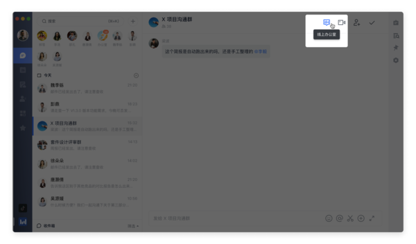 飞书的在线办公室功能对于经常需要沟通的远程办公团队来说非常实用,虽然同事间互不见面,但如同在一间办公室般,可随时随地发起沟通,解决疑问。