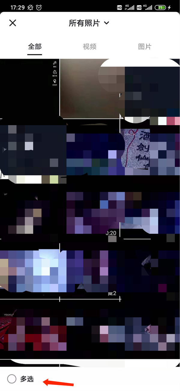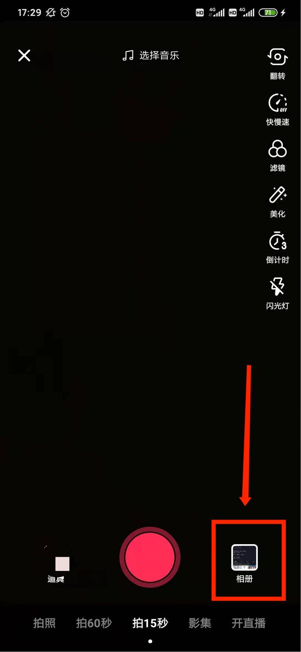 第二步,我们选择【相册】,在录制按钮的右侧便是相册入口选项,开始选择想要上传的视频;