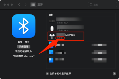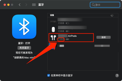 第四步:打开airpods,等待几秒,显示“已连接”,表示mac已经连接airpods。