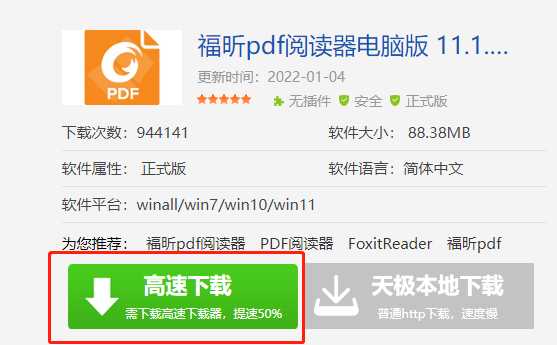 下载途径1:可以直接通过本站进行下载,本站提供福昕pdf阅读器安装包的下载专线,点击“高速下载”,下载速度快,软件绿色安全,还不需要自己去寻找资源。