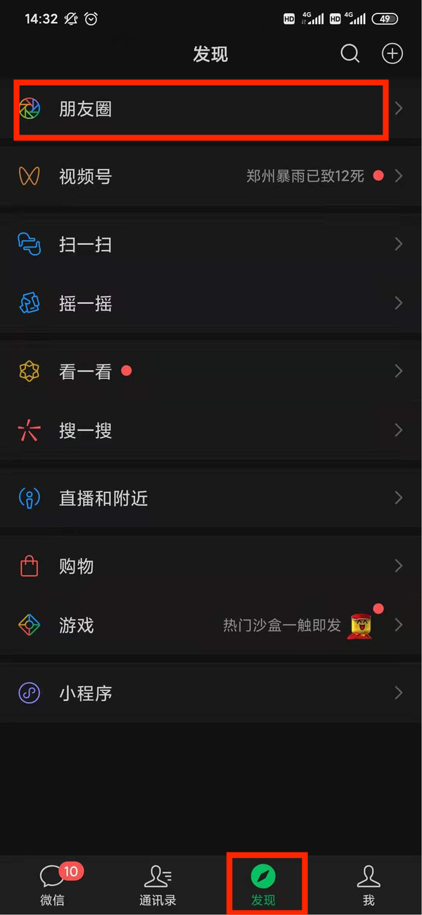 第一步,打开微信,将下方发现页点开,再点击【朋友圈】;