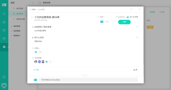 被选定的评审人可以对成员提交的工作汇报进行评价,指出工作汇报中的问题或对成员提出的问题进行回答或设置相关问题跟进人等,实时对员工的工作进行反馈。