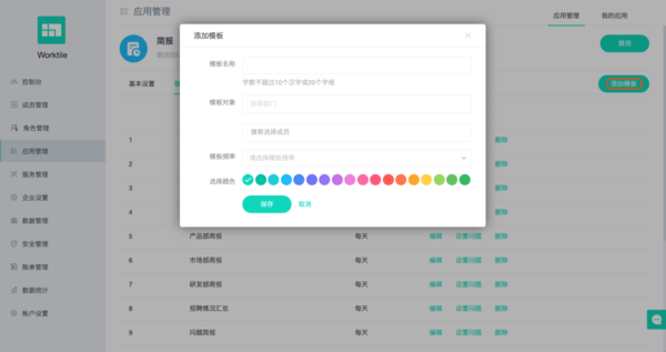 首先,为了规范成员简报提交格式及内容,管理者需要在企业后台设置简报提交模板,模板内容包括模板名称、模板对象和模板频率。