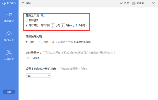 将备份至本地功能开启,选择定时备份并设置备份间隔。