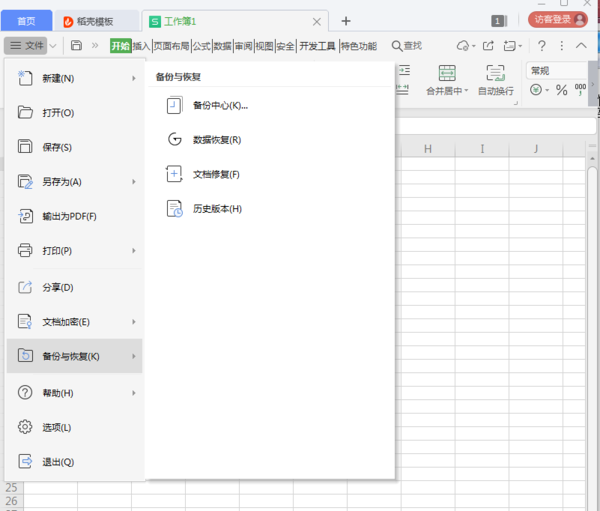 首先打开WPS软件,点击左上角的文件,找到备份与恢复,选择备份中心。