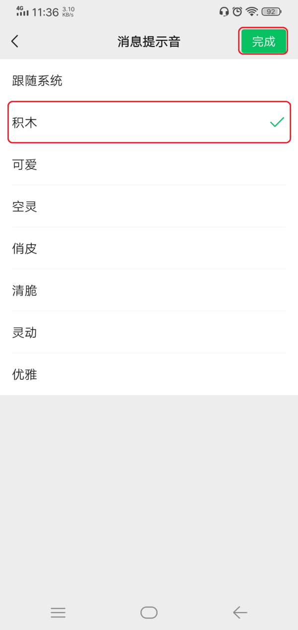 第五步,接着在消息提示音的设置界面中,根据自己的需求来选择一款自己喜欢的提示音,然后点击界面右上角的【完成】按钮。