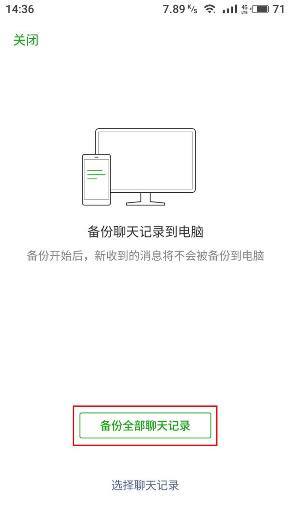 手机上的微信接收到备份通知后,点击备份全部聊天记录,等待系统自动完成备份即可。