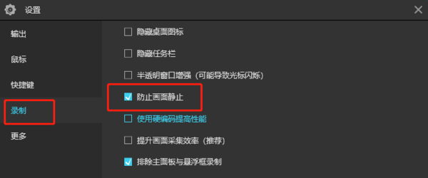 除了没有图像有声音的情况之外,还有可能遇到录制画面卡顿的情况,这时候建议同样是在设置界面,检查一下是否勾选上了“防止画面静止”选项。勾选上之后,能在一定程度上避免出现画面不动,或者是卡顿的情况出现。