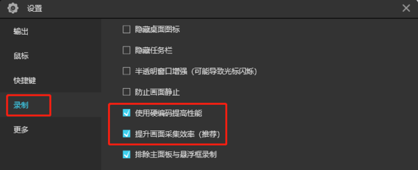 遇到没有图像有声音的情况时,用户可以在傲软录屏主页面,点击页面上方的“设置”键,在弹出的设置窗口汇总,选择录制设置一栏。下滑找到“使用硬件编码提高性能”和“提升画面采集效率”两个选项,取消勾选其中一个再尝试录制,如果还是不行建议将两个选项都关闭掉。
