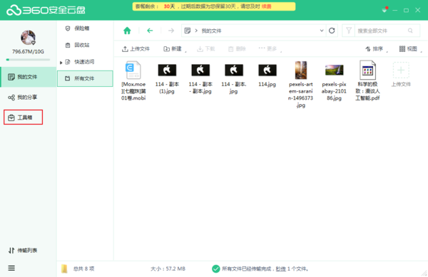 首先打开360安全云盘,点击左侧的工具箱。