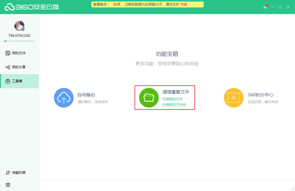 点击工具箱中的清理重复文件功能。