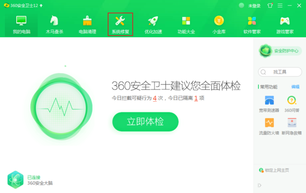 首先打开360安全卫士,点击上方的系统修复。