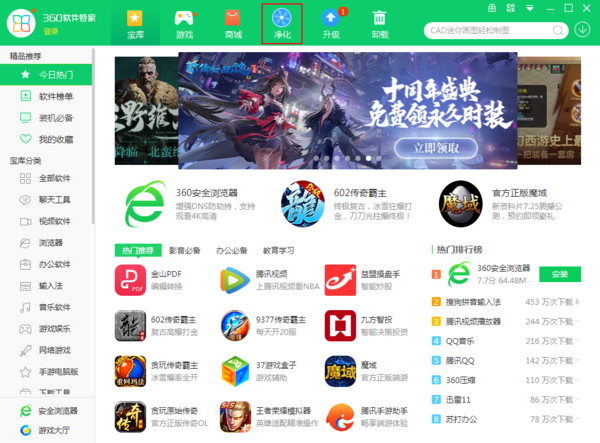 点击软件管家上方的净化功能。