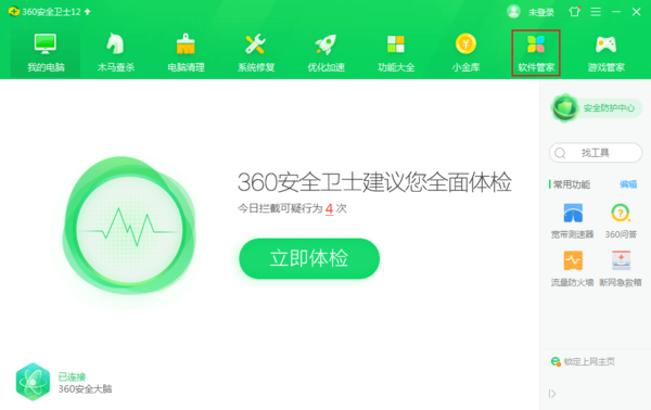 首先打开360安全卫士,点击上方的软件管家。