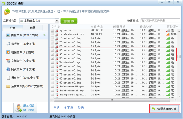完成文件扫描后,将需要恢复的文件勾选,之后点击恢复选中的文件即可。
