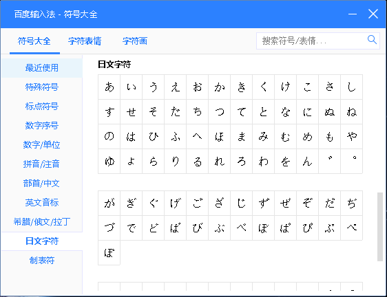 跳转到百度输入法符号大全页面之后,按照分类找到想要添加的符号,比如是日文字符,在确定输入位置之后,再直接点击对应的符号就能添加了。