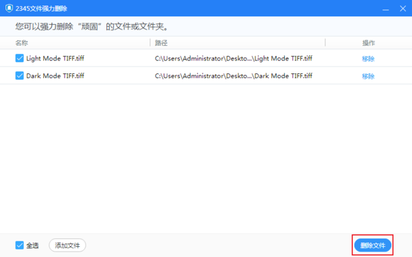 添加好需要删除的文件后,点击右下角的删除文件即可。