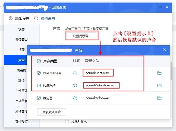 在左侧导航栏选择“声音”,单击“设置提示音”选项,弹窗出现后勾选全部选项,按下面的提示图还原默认声音文件即可。这里我们要注意的是,目前千牛工作台是不支持自定义提示音的。