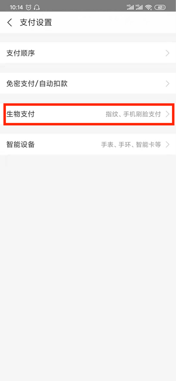 第四步,在支付设置页面中有“生物支付”选项,选中此选项;
