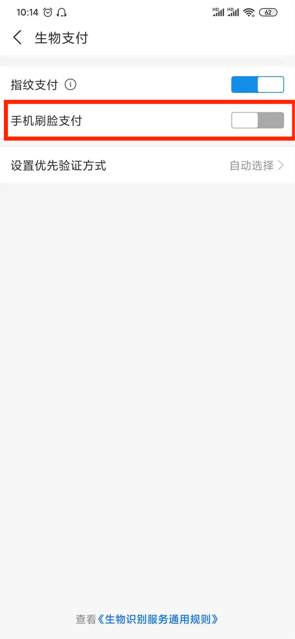第五步,在生物支付页面找到“手机刷脸支付”选项,点击右侧滑块,显示为蓝色便是打开。