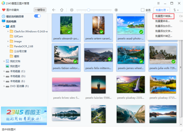 在我们日常工作和生活中经常会收藏一些图片,这些图片可能是作为壁纸使用,也可能是作为素材使用,由于在不同网站下载的图片格式并不相同,因此在整理时不是很方便,这时候我们可以使用2345看图王将这些图片批量转换格式。