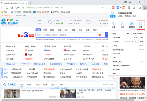 首先打开2345浏览器,点击右上角的菜单,选择设置。