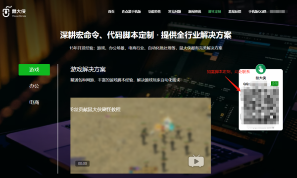 毕竟是脚本定制的页面,因此在页面上,鼠大侠官方并没有介绍太多关于鼠大侠脚本定制的实际功能,只是对鼠大侠脚本定制进行简单介绍。如果我们想进行鼠标定制,或者了解关于它的更多操作,那么可以通过网页右侧的联系方式,与鼠大侠脚本定制负责人进行联系以得到更多信息。