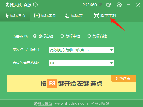 我们打开鼠大侠鼠标连点器,点击主界面上方模块栏中的“脚本定制”,点击后即可跳转至鼠大侠连点器的脚本定制网页,在网页中我们可以看到更多信息。
