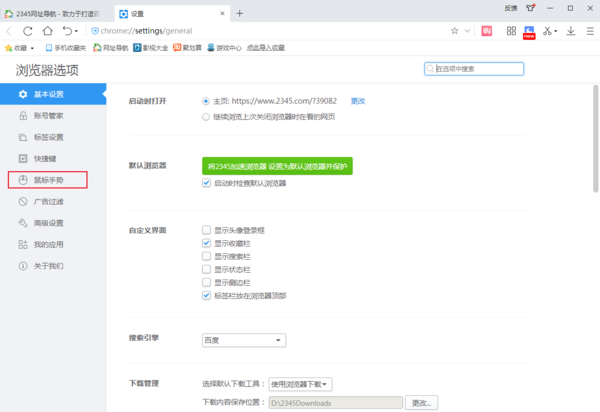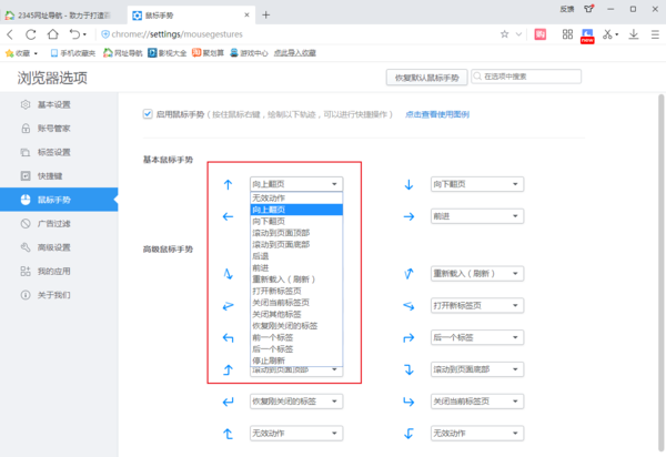 以上就是在2345浏览器中修改鼠标手势操作的方法,除了将手势操作修改为更适合自己的设置外,还可以将一些复杂的手势功能关闭,避免出现误操作。