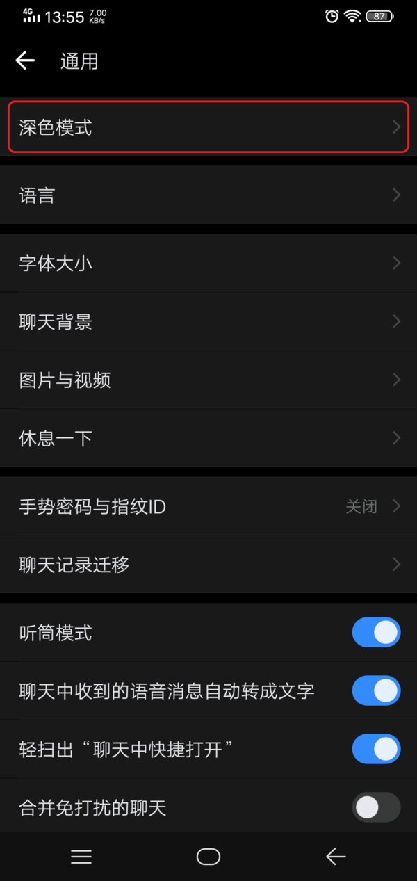第四步,进入到企业微信的通用界面后,找到【深色模式】选项,并点击打开。