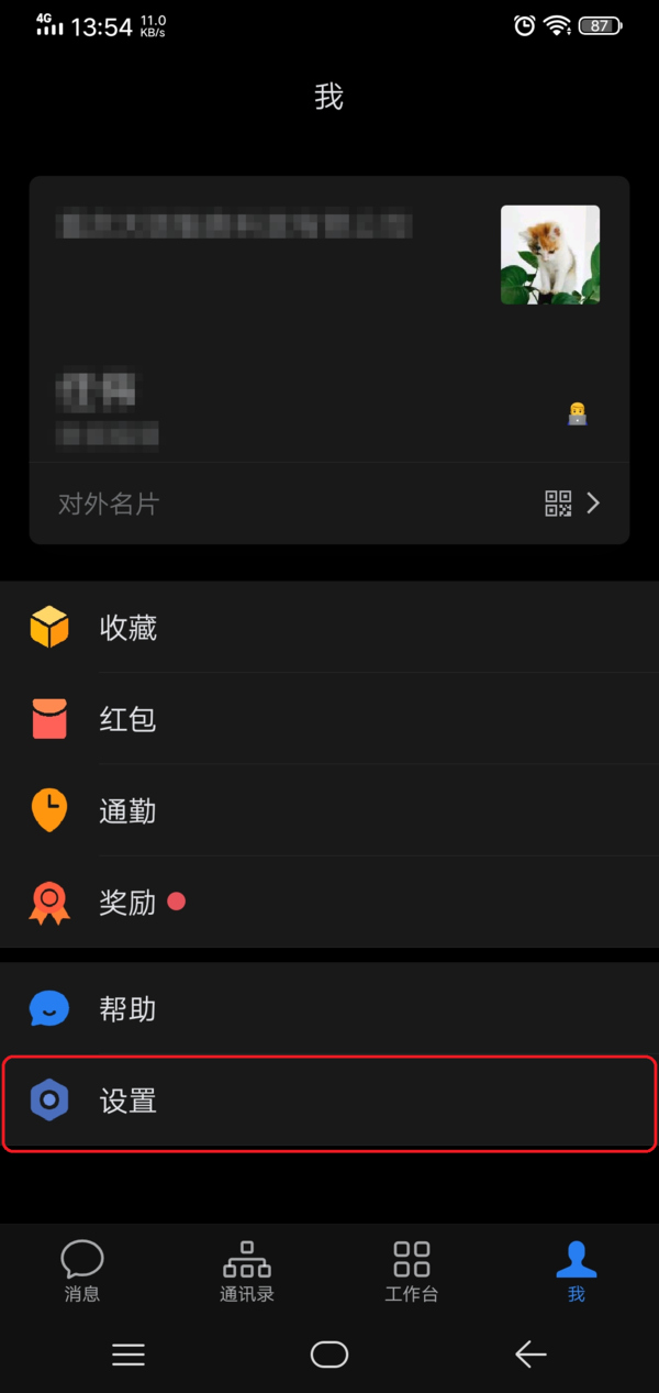 第二步,进入到企业微信的个人中心界面后,找到【设置】功能,并点击打开。