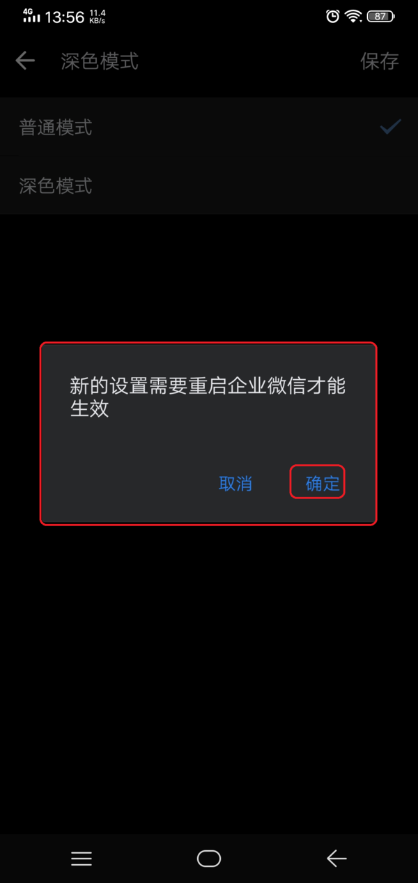 第六步,然后软件会弹出【新的设置需要重启企业微信才能生效】的提示,点击【确定】按钮。