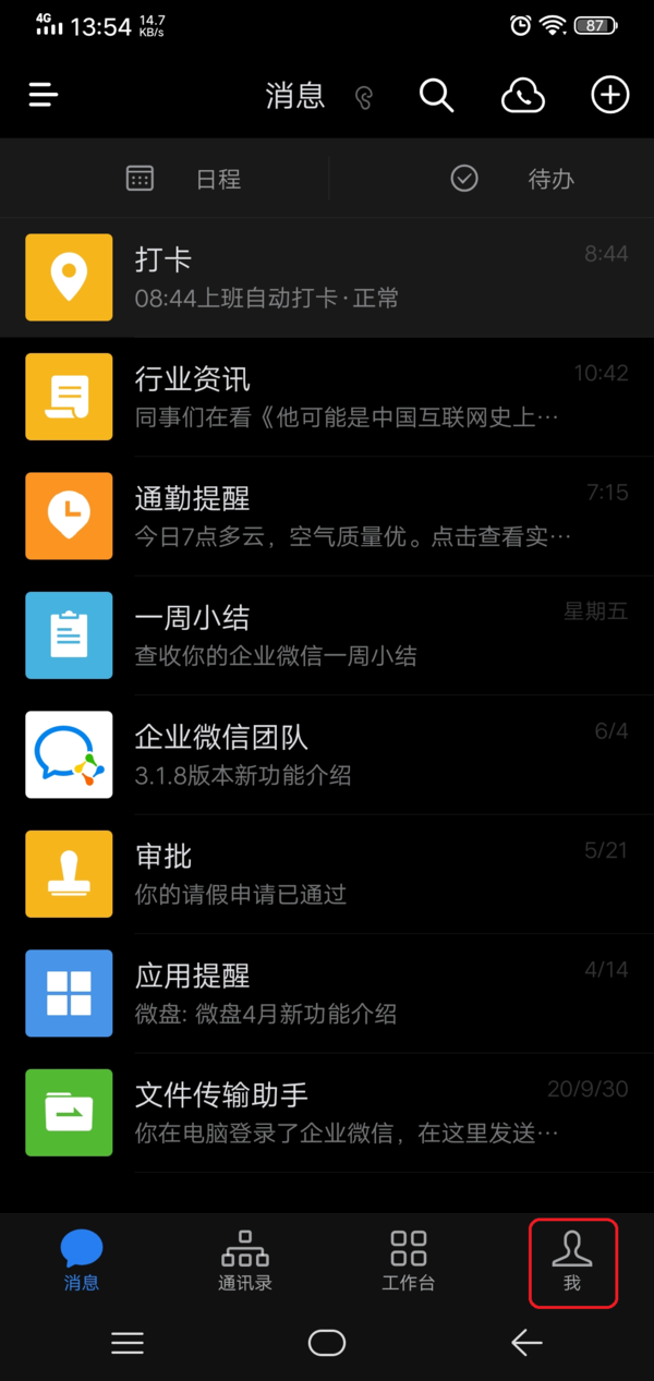第一步,打开企业微信软件,进入到软件的主界面当中后,找到界面右下角的【我】选项,并点击打开。