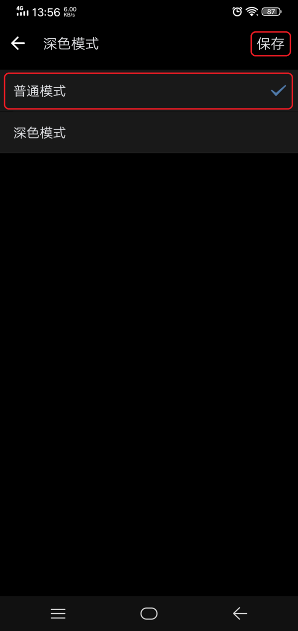 第五步,接着在弹出的深色模式设置界面中,勾选【普通模式】选项,然后点击右上角的【保存】按钮。