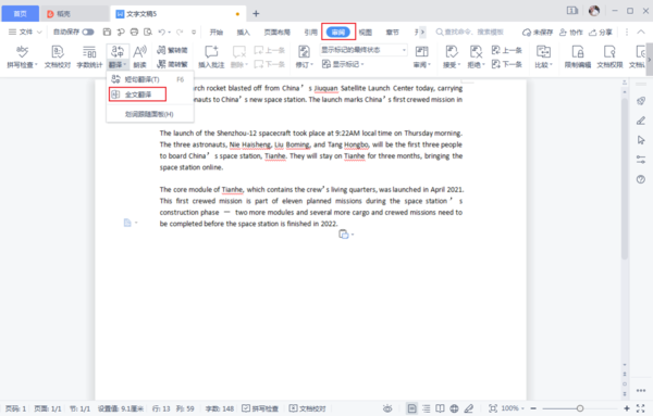 点击工具栏中的审阅,选择全文翻译。