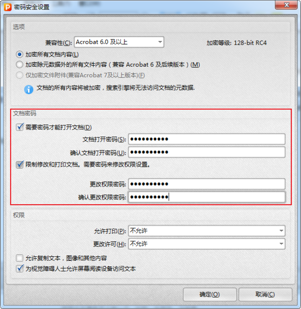 将文档密码下方的两个功能勾选并输入密码,点击下方的确定即可。