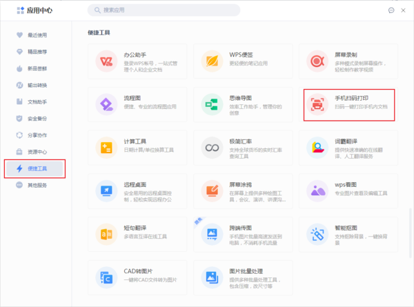 点击左侧的便捷工具,选择手机扫码打印功能。