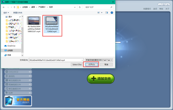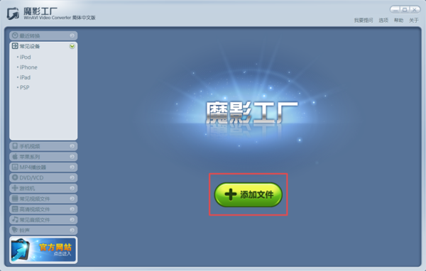 第一步,打开电脑上的魔影工厂软件,进入到软件的主界面当中后,点击界面中间的【添加文件】按钮,然后将需要进行压缩的视频文件添加进来。
