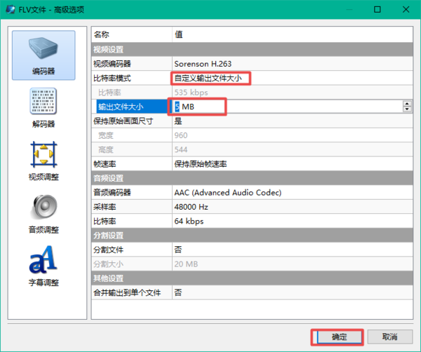 第五步,在软件的高级选项设置界面中,点击界面左侧的【编码器】,然后在右侧的界面中,根据自己的实际需要来设置【比特率模式】、【输出文件大小】、【分辨率】等参数。