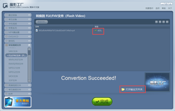 第七步,最后回到软件的主界面当中后,点击【开始转换】按钮即可。最后当文件转换成功后,我们点击【打开输出文件夹】选项,就可以对压缩后的视频进行查看了。