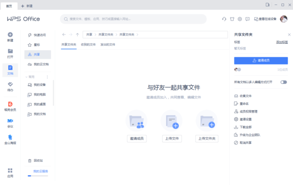 创建共享文件夹并完成成员邀请后,即可在共享文件夹中自由上传和下载文档和素材,将文档以多人编辑方式打开后,还可以多个成员共同编辑一个文档,非常实用。