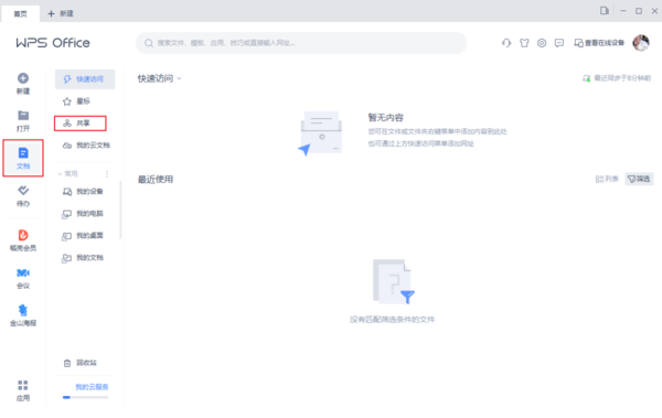 首先打开WPS,点击左侧的文档,选择共享。