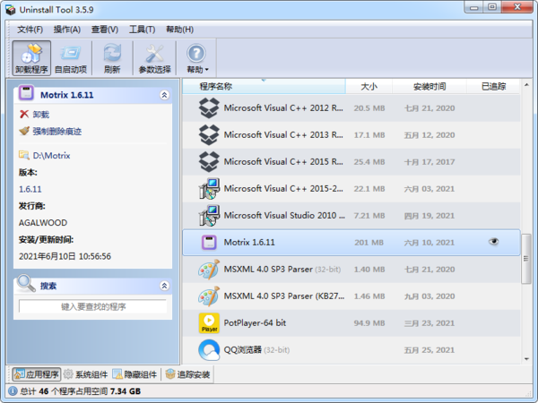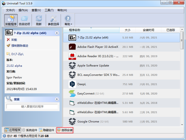 完成以上操作后,在Uninstall?Tool的应用程序列表中就可以查看软件的追踪数据了。