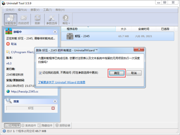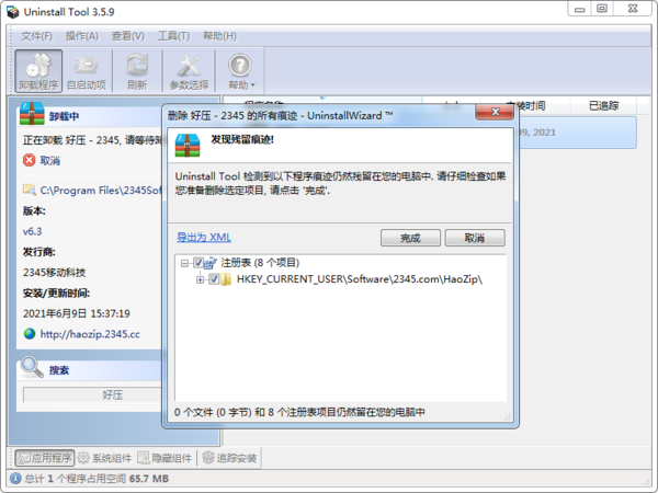 完成软件的卸载后,Uninstall?Tool会进一步扫描注册表和软件的残留文件,点击确定。