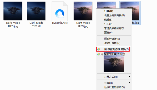 首先选择需要转换格式的图片,右键点击后选择用蜂蜜浏览器转换。