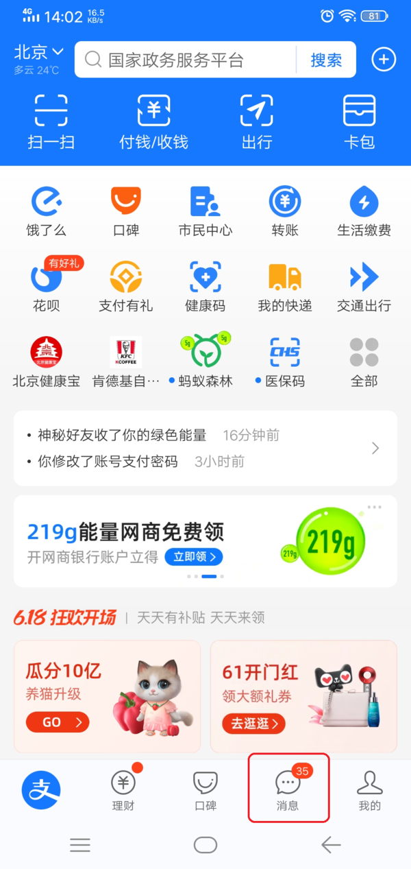 第一步,在手机上找到支付宝应用,然后点击打开,进入到支付宝的主界面当中后,找到【消息】选项,并点击进入。